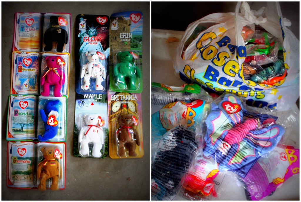 i also found a box of "collectibles" - some 80's barbie dolls given to us by an aunt {omg it's malibu barbie & skipper!} and a BUTTLOAD of mcdonald's promotional beanie babies still in their packages.
